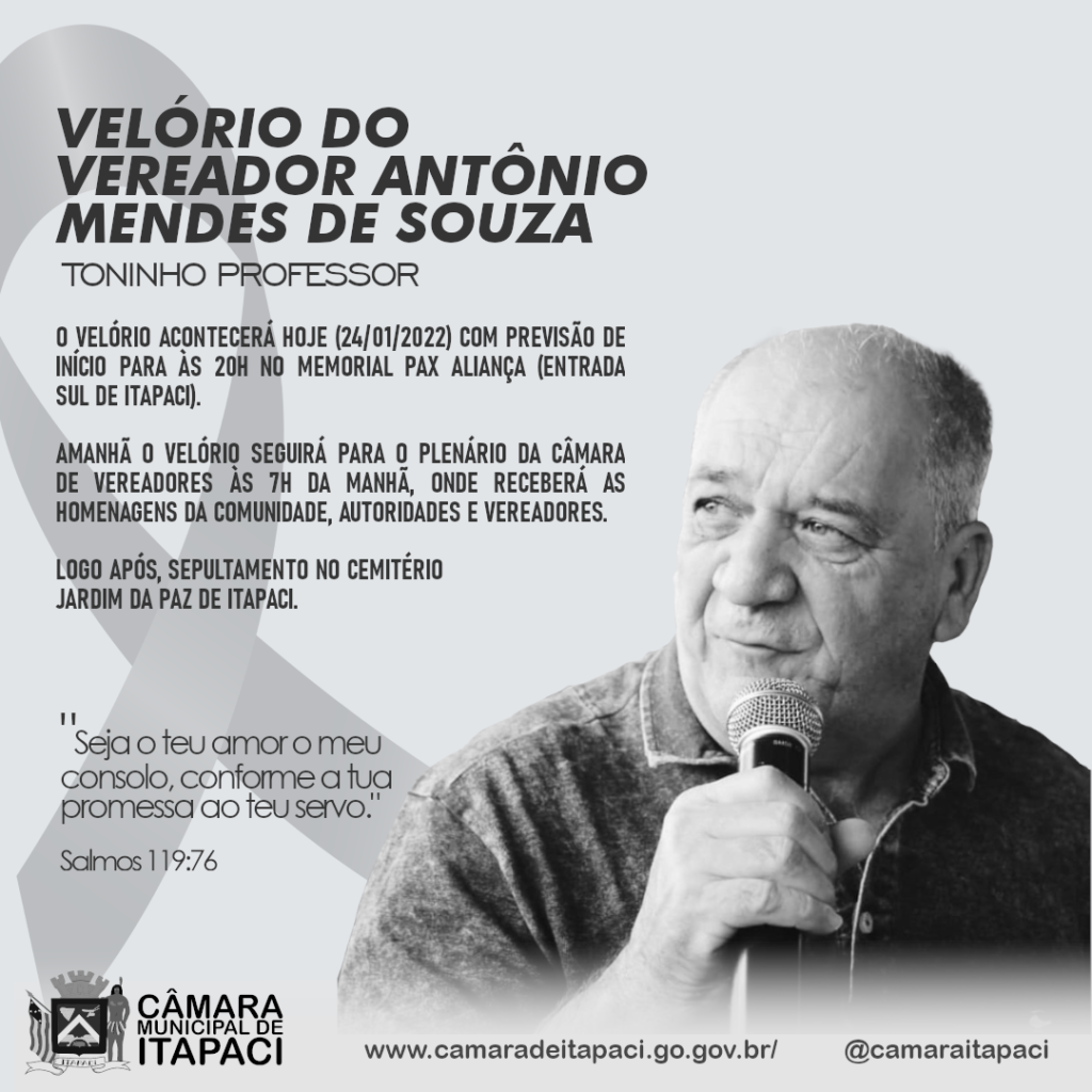 CÂMARA DIVULGA HORÁRIO DO VELÓRIO E SEPULTAMENTO DO VEREADOR TONINHO PROFESSOR